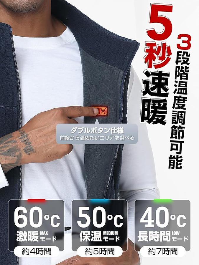 ➤ 3段階温度調節(40℃/50℃/60℃): その日の気温や活動量に合わせて、弱めの「じんわりモード」から強力な「即温モード」までお選びいただけます。