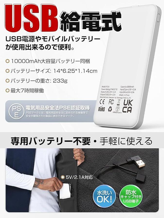 付属の大容量10000mAhモバイルバッテリーや、市販のバッテリーに接続するだけで、すぐに暖かさをご体感いただけます。