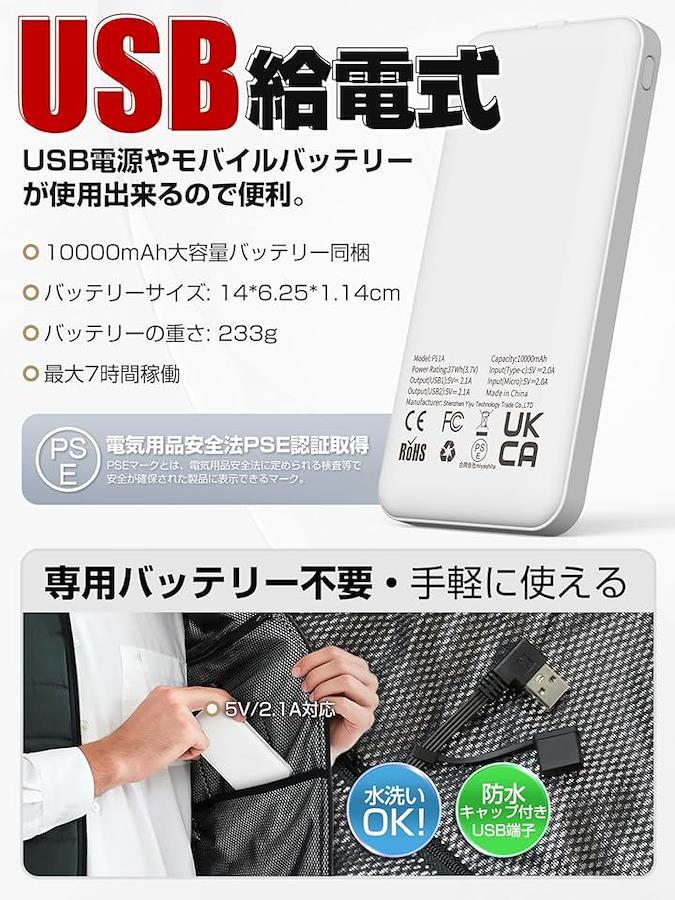 「最大7時間の連続発熱」大容量10,000mAhバッテリー付属。