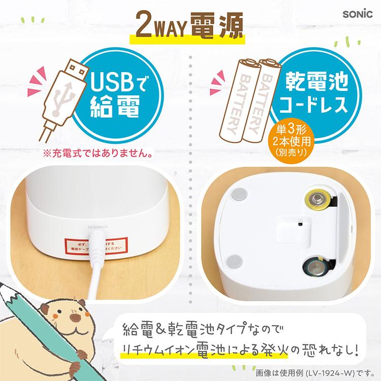 ■電源1:単三アルカリ乾電池(LR6)2本使用(別売)2:専用USBケーブル(DC 5V 2A)1、または2のどちらかを使用。