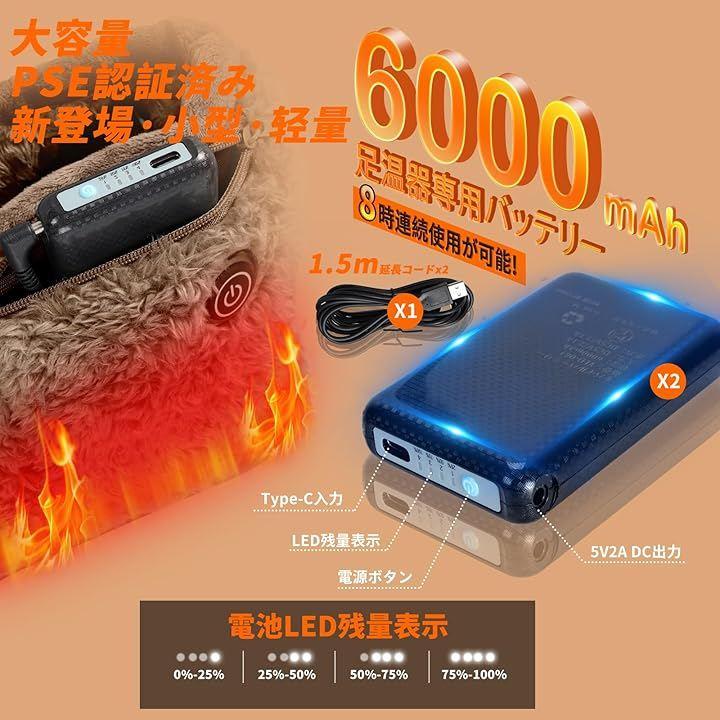 「2x6000mAhバッテリー&3段階温度調節」電気 スリッパ コードレスには最大約7.5時間が使える6000mAhの大容量モバイルバッテリーを2つも付属され、とてもお買い得で別途での購入は必要ありません。