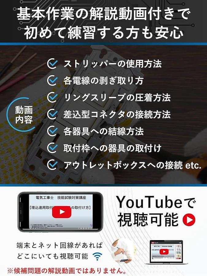「特徴3」付属の動画解説では、はじめての方でもわかりやすいよう、器具の結線方法や、リングスリーブの圧着方法など、基本作業を細かく解説。