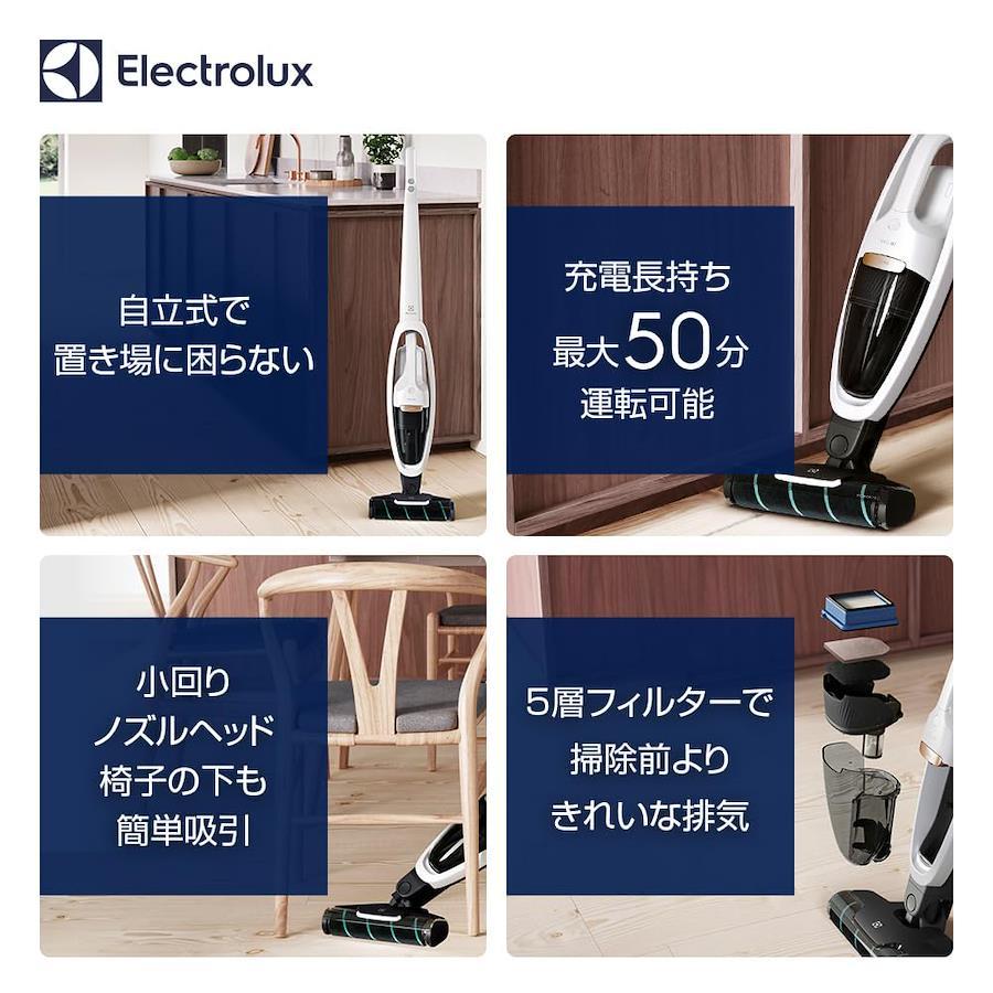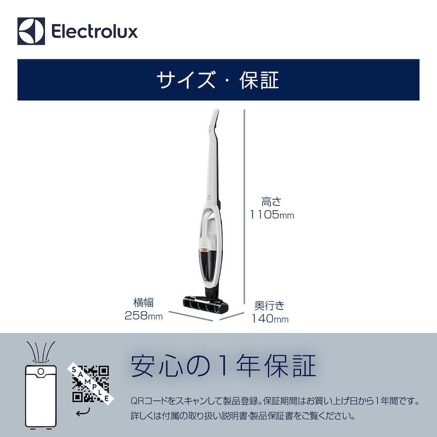 ENJOY YOUR HOMEお掃除ストレスから解放される多機能クリーナー。いつでも簡単、隅々までキレイに。 商品詳細 充電池: リチウムイオン電池 (Li-ion) DC 21.6V 連続使用時間 通常モード: 約50分 / 最大モード 約14分 充電時間: 約4時間半 本体色: インディゴブルー 入力電力: 100V (50/60Hz) 出力電力: 35V 500mA 消費電力(1時間充電): 約13.2Wh 消費電力(充電完了後/1時間): 約0.5W 電源コードの長さ: 1.8m 運転音(dB): 最大79 付属品・消耗品 ブラシロールクリーンフロアノズル x1 すき間ノズル x1 ブラシノズル x1 サイクロン x1 多層フィルター x1 排気フィルター x1 ACアダプタ&充電ステーションセット x1 ソフトブラシノズル x1 エレクトロラックスのご紹介スウェーデン生まれの100年ブランドElectrolux。「Swedish thinking. Better living.」の理念のもと革新的な製品を考え抜き