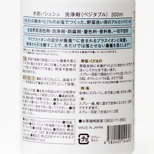 素材そのものを楽しむお野菜や、皮ごと食べたいフルーツから農薬やワックスを除去。お肉やお魚に吹きかければ、臭み消しにも。99%の純水を1%のお塩を電気分解して作った、農薬除去用野菜洗いアルカリ性電解イオン水です。