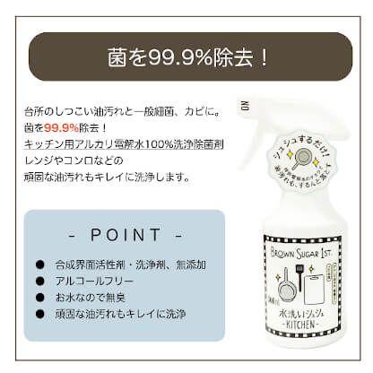 お料理を作る両親にも、食べる子どもにもやさしく。キッチン用アルカリ電解水100%洗浄。台所のしつこい油汚れと一般細菌、カビに。