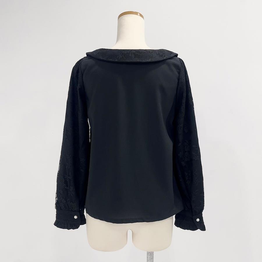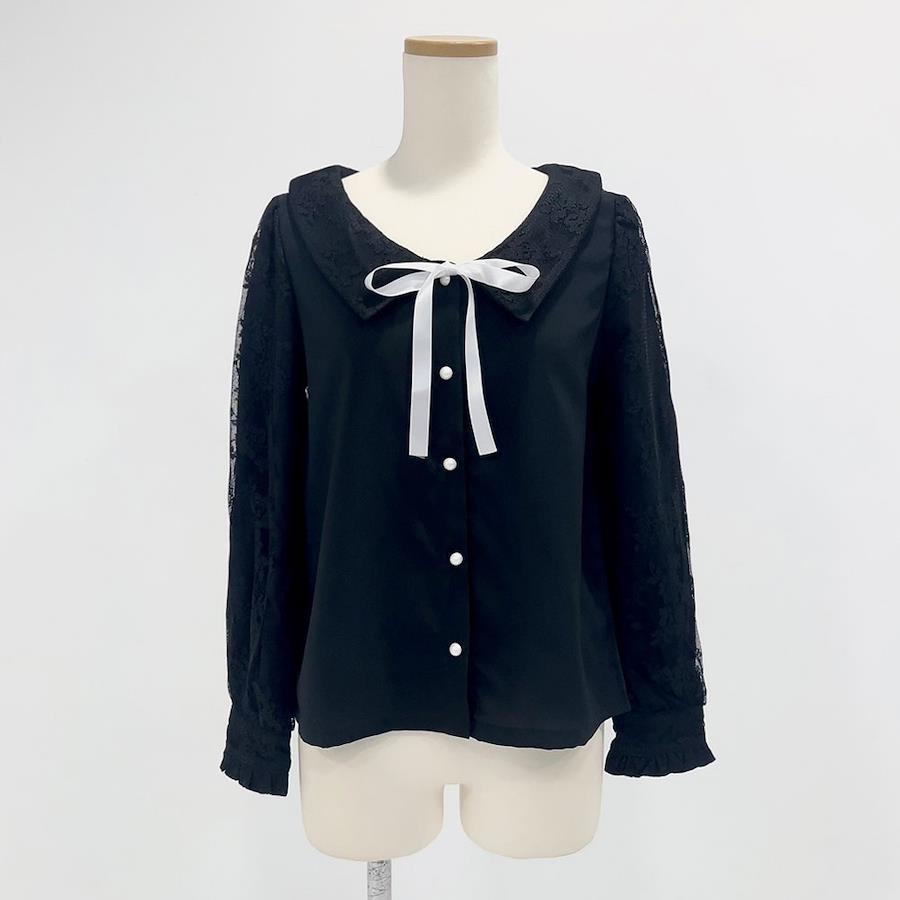 上品なレースが可愛い襟が選べるブラウスのご紹介。【デザイン】襟と袖に重なったレースがポイントのブラウスです。角襟とセーラー襟の2種類から襟タイプをお選びいただけます。付属のリボンタイは取り外し可能で、ご自身で結んでいただく仕様です。袖のカフスはボタン式になっていますが、ボタンを外さなくてもすっぽり着ていただける嬉しいサイズ感です。前立てとと袖カフスのパールボタンが上品見えするデザイン。前ボタンを開けて着脱する仕様なのでヘアアレンジした後でも着用いただけます。シンプルでどんなコーデも合わせやすいデザインなので、1枚持っていると着回し抜群なアイテムです。