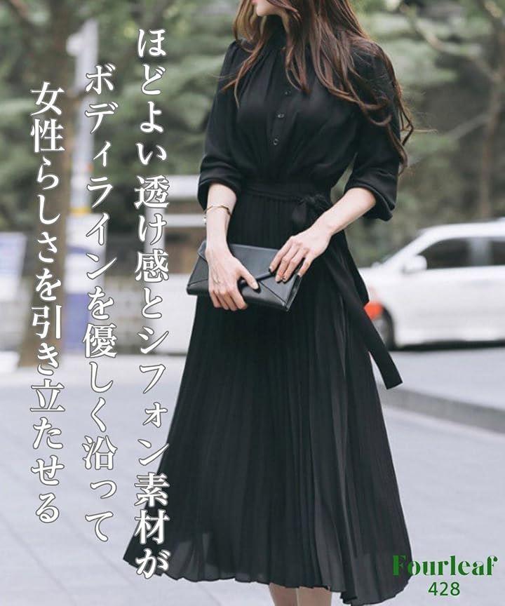 清楚系のデザインに、フリルやベルト、シフォン素材のプリーツが加わり、女性らしい可愛いらしさと華やかさが漂います。