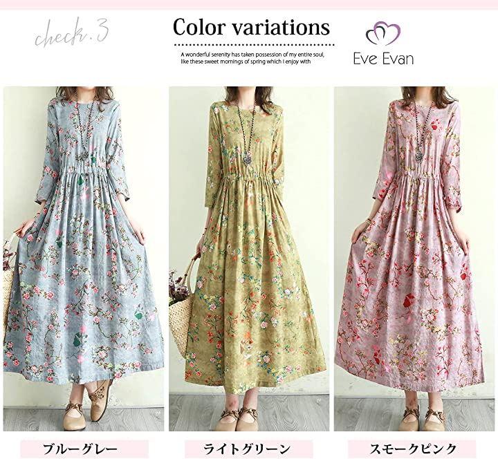 「選べるカラバリ*ワンピースでは珍しい豊富なサイズ展開*」ブルーグレー、ライトグリーン、スモークピンクの全3色。どれも派手すぎないくすみ感のあるお色味なので初めて花柄に挑戦される方にもおすすめです。