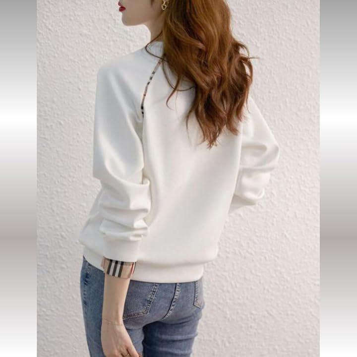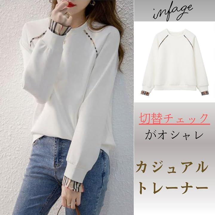 「袖口のチェックフリルがオシャレ カジュアルトレーナー」 清楚な印象を与える白地に、チェック柄を組み合わせたカジュアルトレーナーの登場です。