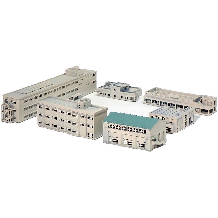 校庭含む推奨敷地サイズ:約 20cm x 10cm本校舎サイズ:約 13cm x 2.5cm x 高さ3cm体育館サイズ:約 5cm x 4cm x 高さ2.5cmそのほか4棟、全6パーツ