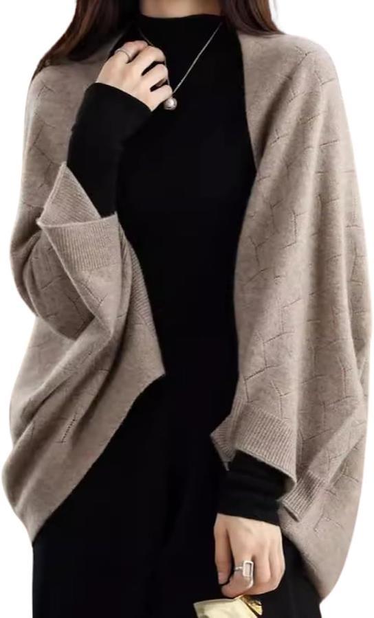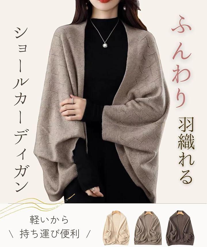「ショール風のおしゃれなデザイン」 ショールを肩にかけているような、ポンチョをかぶっているような、さらっと羽織れるおしゃれなデザインのケープ風カーディガンです。