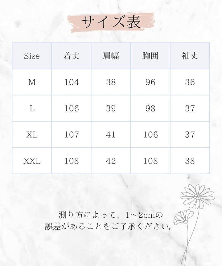 「サイズ」M L XL XXLの4サイズ展開 《M》着丈:104, 肩幅:38, 胸囲:96, 袖丈:36 《L》着丈:106, 肩幅:39, 胸囲:98, 袖丈:37 《XL》着丈:107, 肩幅:41, 胸囲:106, 袖丈:37 《XXL》着丈:108, 肩幅:42, 胸囲:108, 袖丈:38
