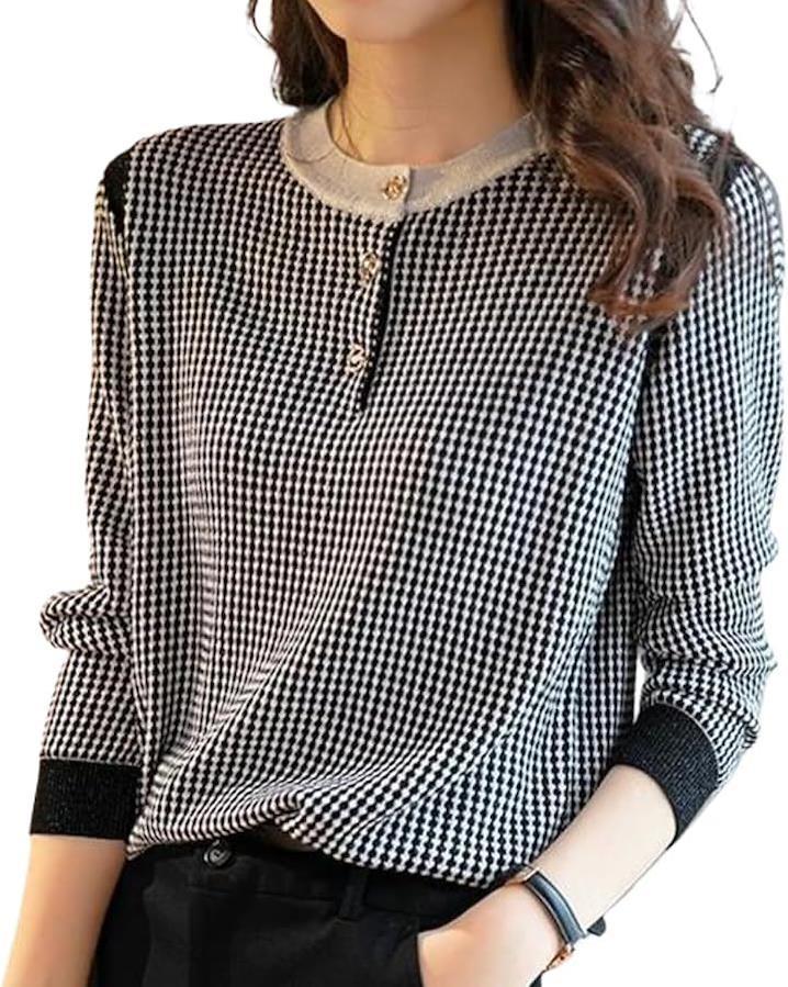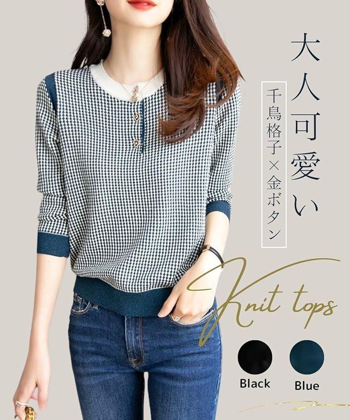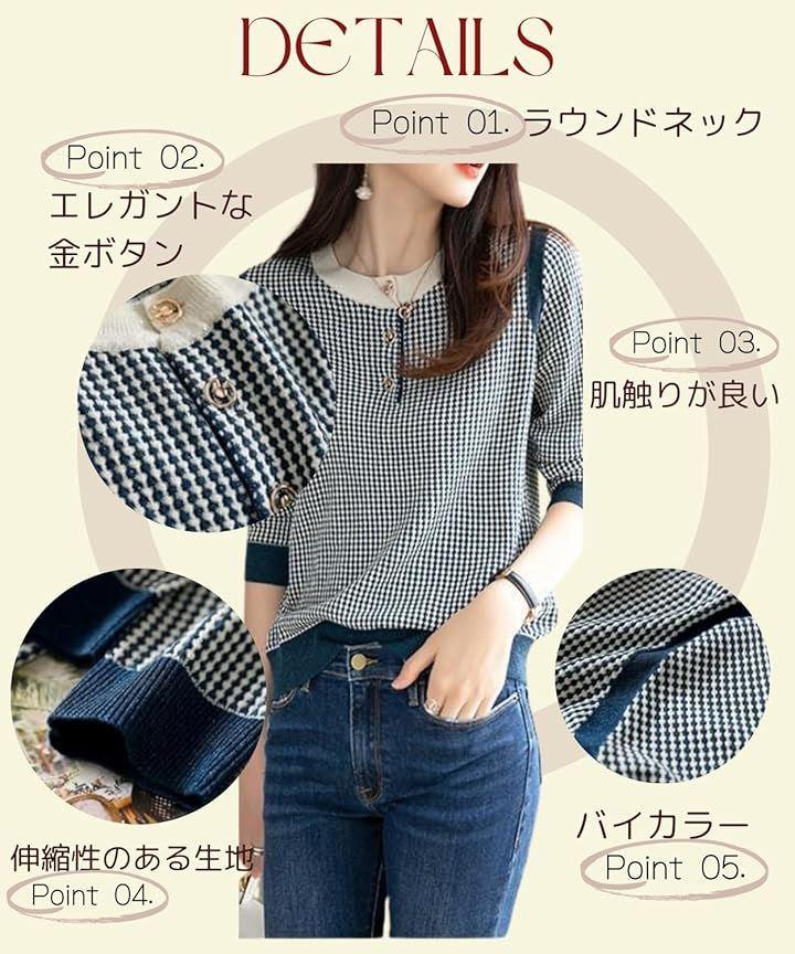 「上品な千鳥格子x金ボタン」 クラシカルな千鳥格子柄に、金ボタンのハーフボタンデザインがアクセント。