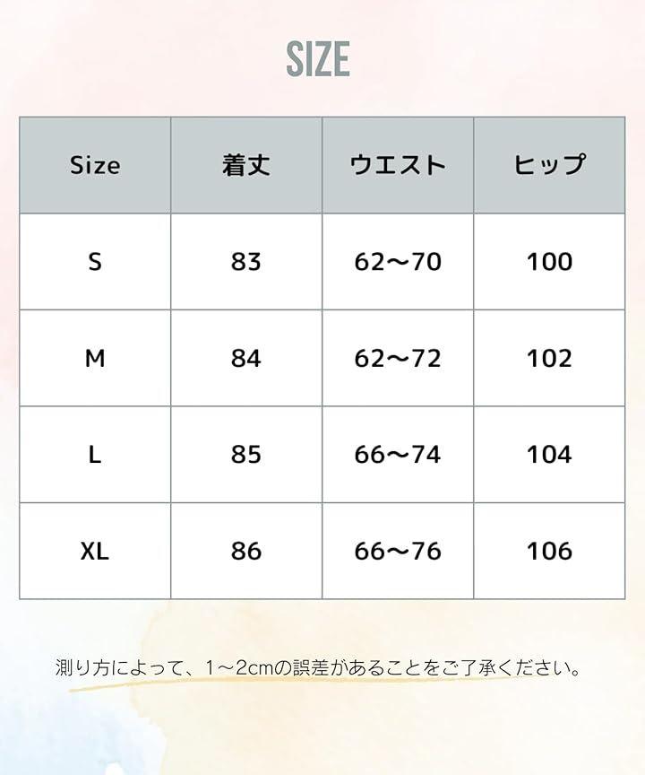 S :着丈83、ウエスト62~70、ヒップ100 M:着丈84、ウエスト62~72、ヒップ102 L:着丈85、ウエスト66~74、ヒップ104 XL:着丈86、ウエスト66~76、ヒップ106