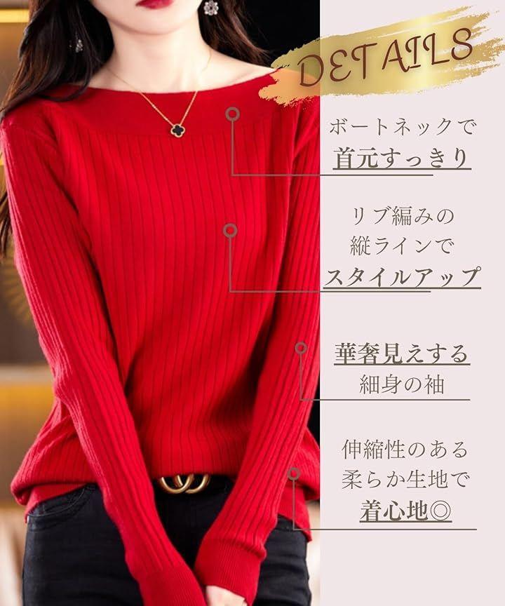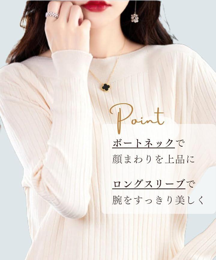 ロングスリーブで腕をすっきり見せ、ボートネックが顔まわりをきれいに見せてくれます。