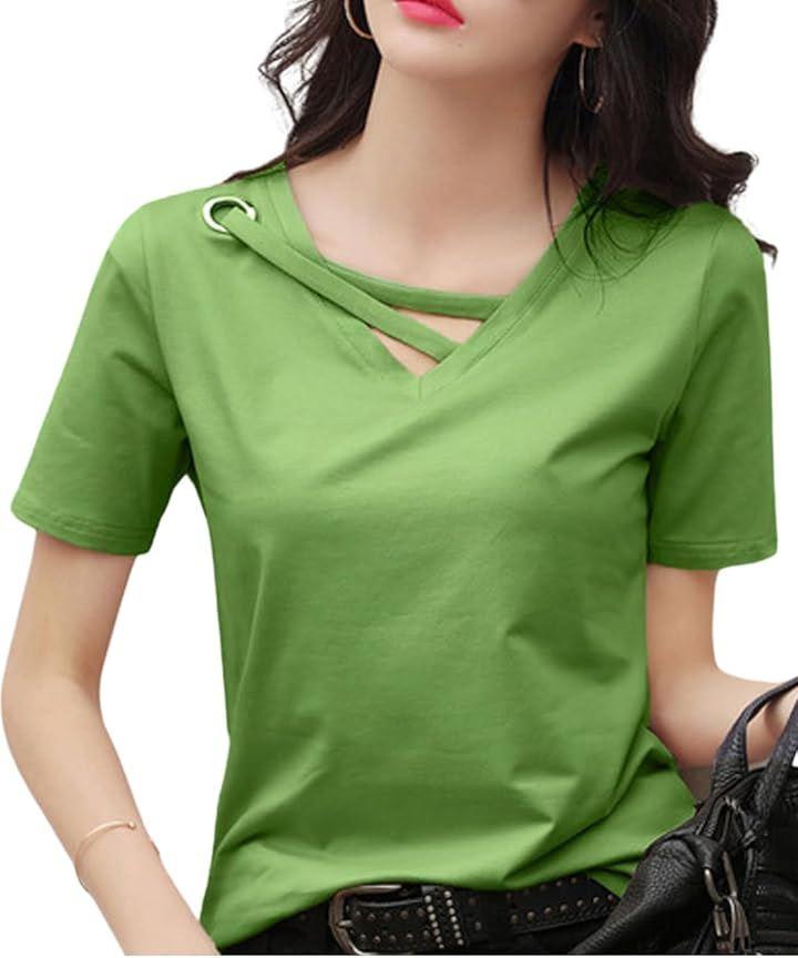 「おしゃれなVネック、ワンポイントデザイン」シンプルでありながら、ネック部分にデザイン性があり、ぱっと目をひくおしゃれな半袖カットソーです。