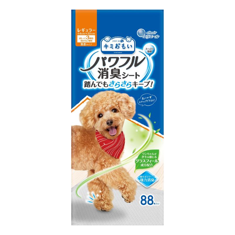 ・おしっこをたっぷり吸収するから、おしっこ跡を踏んでも足裏がぬれにくいので、お留守番時などなかなか取り替えられないときなども安心です。・消臭機能付き。おしっこのニオイをしっかりブロック!・おしっこの色が見やすい「オフホワイトカラー」でいつでもおしっこの色をチェック・グラスフィール成分配合!芝生に含まれる成分を配合で、ワンちゃんがまるでお外でトイレをしている気分に!(※ヒトには感じず、ワンちゃんのみに感じ取れる香りです。)・レギュラーサイズ・シーツサイズ:約44×32(cm)