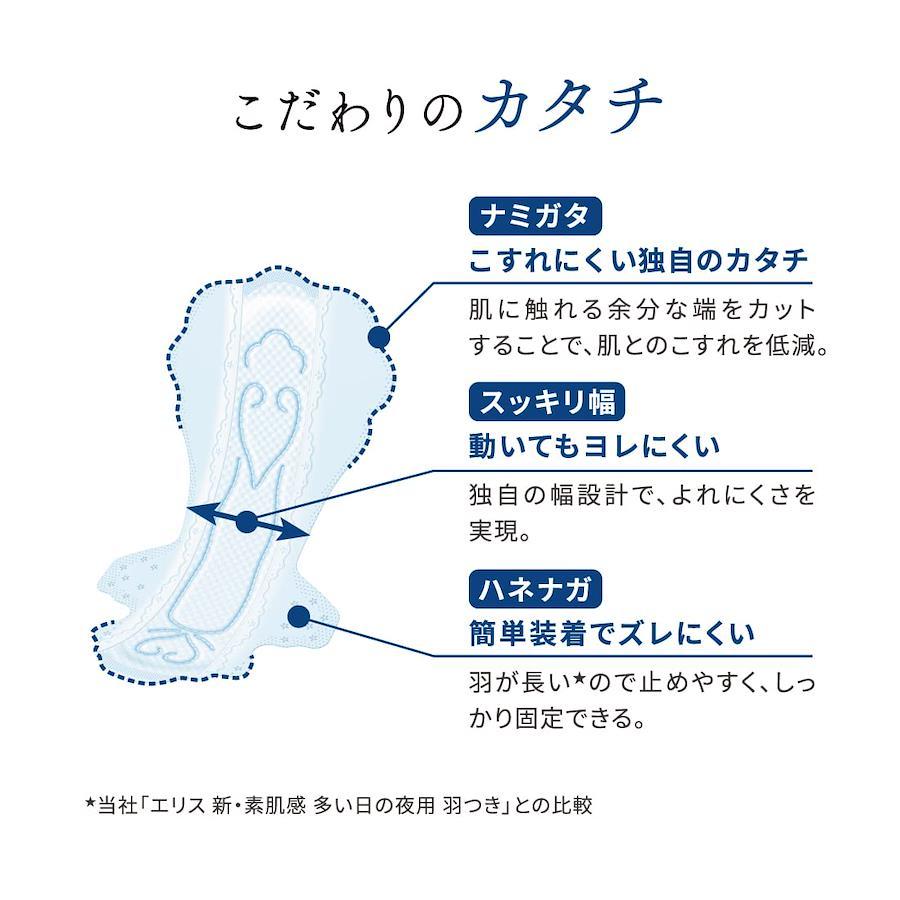 今日もエリスが、そばにいます。 ふんわり肌あたりやわらかな「うるさらシート」:肌とのこすれを低減した※1肌あたりのやさしいシート採用。 経血吸収後もさらさら感続く:経血をスッと吸収、経血が肌に触れにくいからべたつきにくい。 通気性バックシート採用:肌トラブルの原因となるムレを低減。 足まわりまでやさしい素材:肌への摩擦を低減したギャザー採用※2。 【ハネナガ】簡単装着でズレにくい:羽が長い※3ので止めやすいからしっかり固定できる。 【ナミガタ】こすれにくい独自のカタチ:肌に触れる余分な四隅をカットすることで、肌とのこすれを低減。 【スッキリ幅】動いてもヨレにくい:独自の幅設計で、よれにくさを実現。 ※1当社従来品比 ※2肌への摩擦によるせん断応力を約42%低減。当社従来品比 ※3当社「エリス新・素肌感ふつう~多い日の昼用羽つき」との比較