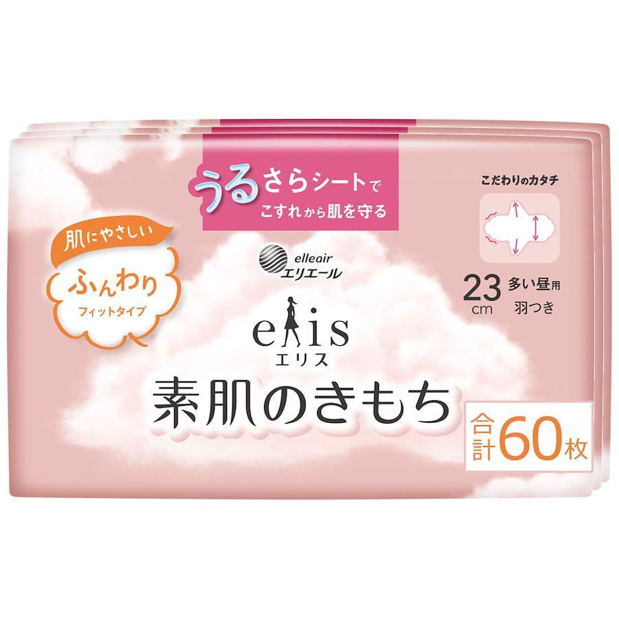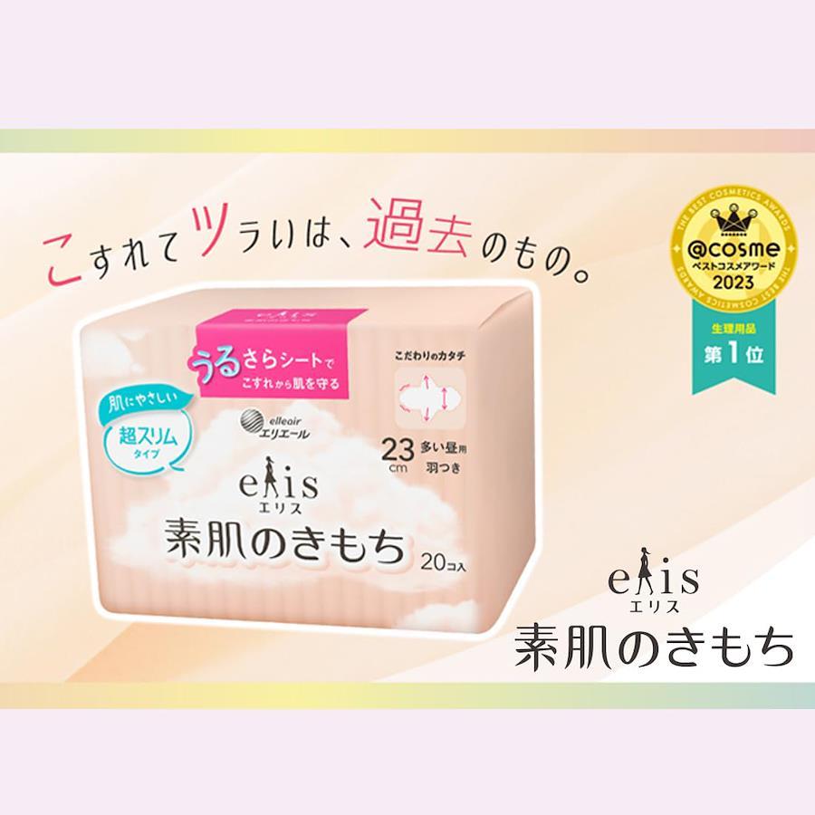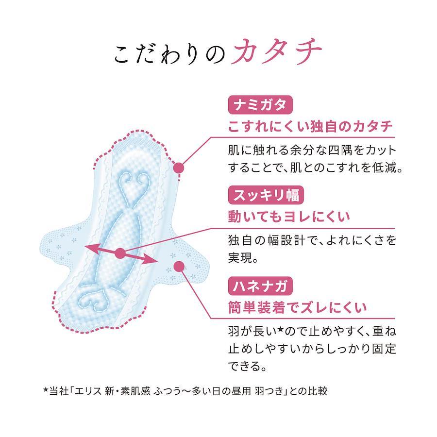 エリスブランドメッセージ: だれかではなく、あなたのそばに。 ひとの数だけ、くらしや価値観があるように。 生理に対する想いや悩みは、ひとりひとり違うから。 エリスは、ほかのだれかではない、あなたの気持ちを大切に。 あなたが望む生理の過ごし方を支えていきたい。 繊細な肌に直接ふれ、こころとからだに向き合うからこそ、 これまでのあたり前にしばられない発想で ひとりひとりと生理の関係を、もっとここちよく。 あなたがあなたらしくいられるように。 今日もエリスが、そばにいます。 ふんわり肌あたりやわらかな「うるさらシート」:肌とのこすれを低減した※1肌あたりのやさしいシート採用。 経血吸収後もさらさら感続く:経血をスッと吸収、経血が肌に触れにくいからべたつきにくい。瞬時に経血を吸収してくれるから、モレ安心。 通気性バックシート採用:肌トラブルの原因となるムレを低減。 足まわりまでやさしい素材:肌への摩擦を低減したギャザー採用※2。 【ハネナガ】簡単装着でズレにくい:羽が長い※3ので止めやすく、重ね止めしやすいからしっかり固定できる。