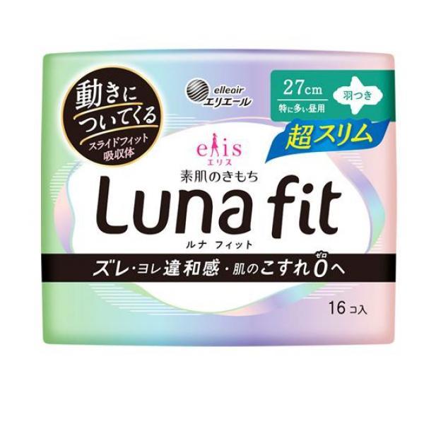 製品の特徴●elleair elis Luna fit エリエール エリス 素肌のきもち ルナフィット超スリム(特に多い昼用)羽つき 27cm●医薬部外品●生理用ナプキン●ズレ・ヨレ違和感・肌のこすれ0(ゼロ)へ。●動きについてくる「スライドフィット吸収体」…ナプキン内部に空間層を持つから吸収体が自在にスライド。身体の動きについてくるから肌とのスキマができにくく、ナプキンのズレ・ヨレを低減。経血もしっかりキャッチ。●肌へのやさしさを考えた「独自のカタチ」…高いフィット感でデリケートゾーンのこすれを抑えて、生理中の敏感な肌にもやさしい。●ベタッと感を低減する「表面ぽこぽこシート」…繊維が細いシートはなめらかな肌触り。経血をスッと吸収し、肌に触れにくいからべたつきにくい。●販売名:エリスMNS-USLW126