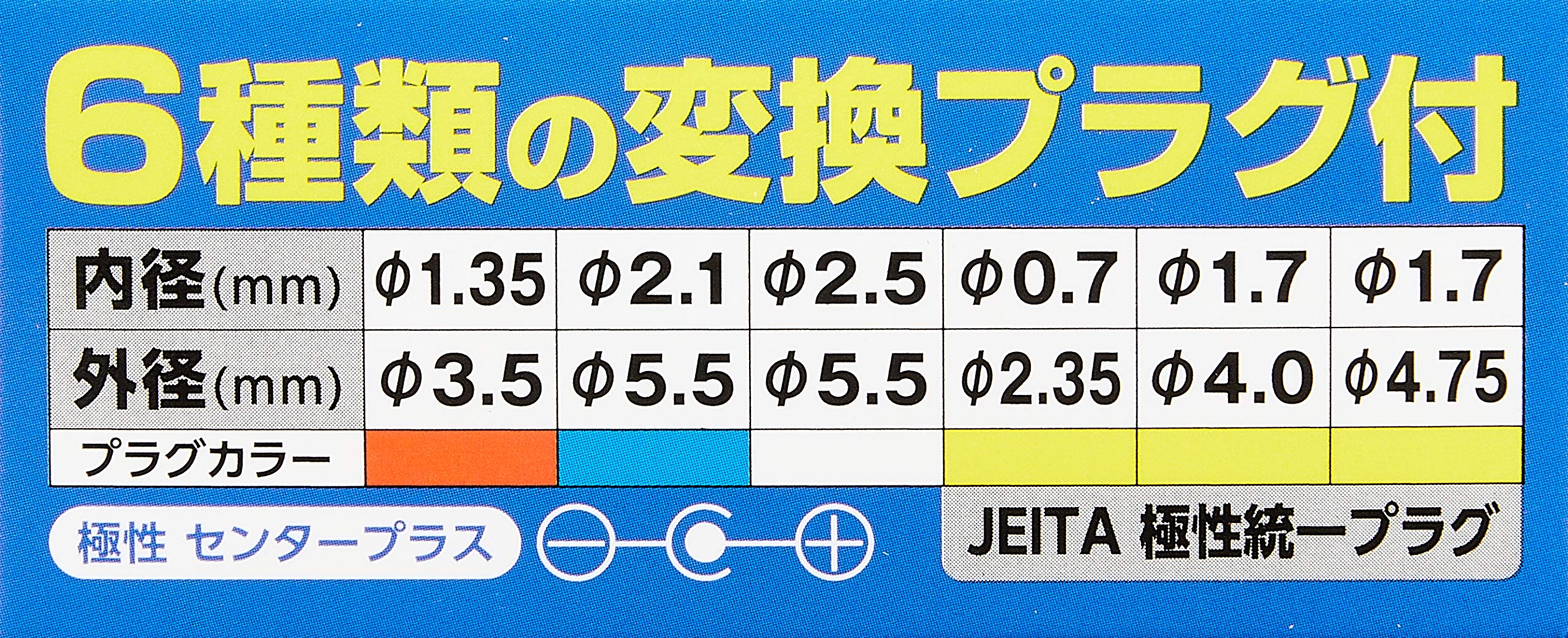 3営業日以内に発送≪新品未開封品≫:■定格入力:AC100V 50/60Hz ■定格出力:DC6V/1000mA ■コード長:約1.8m ■極性:センタープラス ■変換プラグサイズ: 内径/外径(mm):φ1.35/φ3.5 内径/外径(mm):φ2.1/φ5.5 内径/外径(mm):φ2.5/φ5.5 内径/外径(mm):φ0.7/φ2.35(JEITA 極性統一プラグ) 内径/外径(mm):φ1.7/φ4.0(JEITA 極性統一プラグ) 内径/外径(mm):φ1.7/φ4.75(JEITA 極性統一プラグ)
