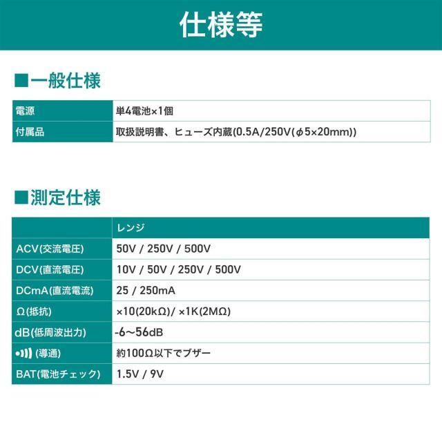 ■背面内臓マグネットで本体を固定できるので両手で操作可能です■本体横にテストリード収納可能■ブザーとLEDで知らせる導通チェック■1.5Vと9V電池のチェックができます