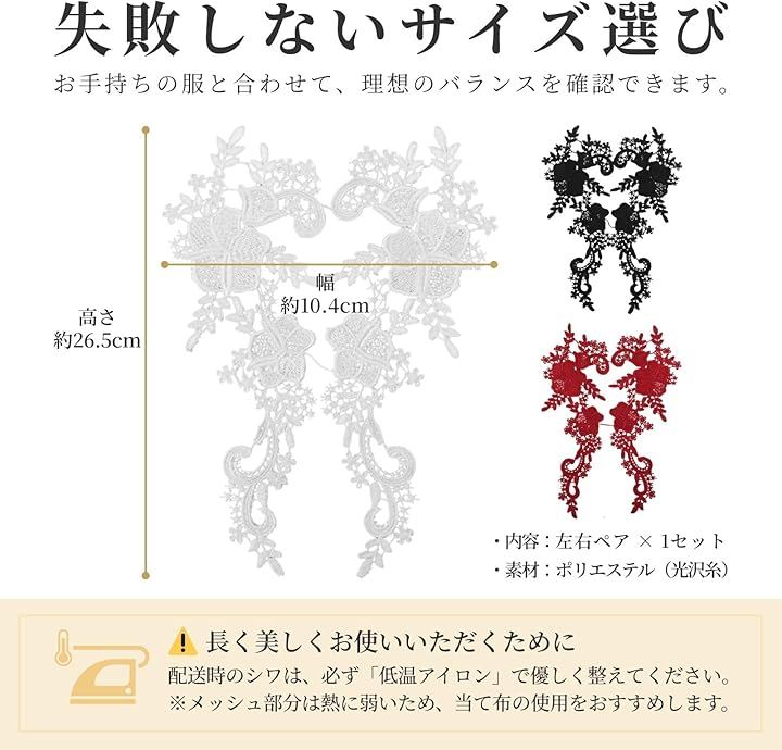 「仕様・サイズ」 素材:ポリエステル(光沢糸使用) / サイズ:高さ約26.5cm x 幅約10.4cm(ホワイト)*カラーにより微差あり / 内容:左右ペアセット / カラー:白(ホワイト)、黒(ブラック)、赤(レッド)の3色展開 / 大切な方へのギフトを手作りする際や、クオリティを求める業務用の素材としても選ばれています。
