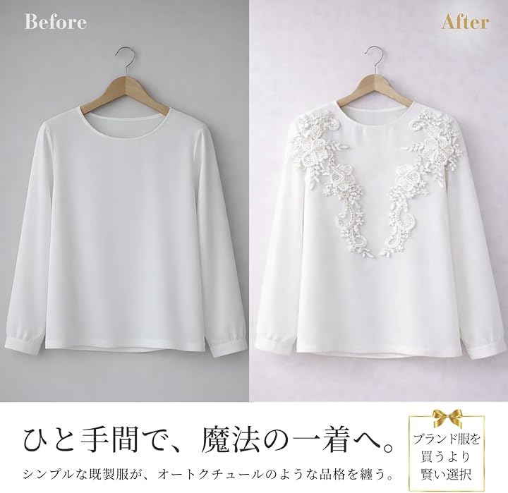「いつもの服が、オートクチュールのような一着に」 シンプルなブラウスやワンピースに縫い付けるだけで、見違えるような「品格」をプラスします。