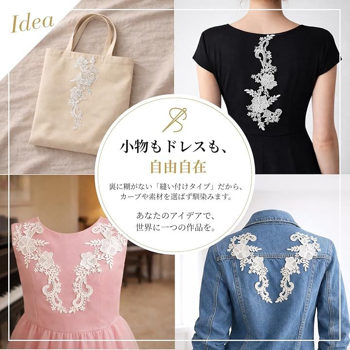 「自由自在なアレンジで、自分だけのデザインを」 裏面に糊のない「縫い付けタイプ」だからこそ、使い方は無限大です。