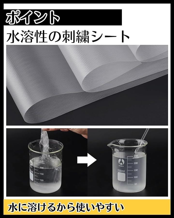 「水に溶ける」水に溶けるタイプなので、図案を写して刺繍した後、水で洗い流すとシートが溶けて消えます。