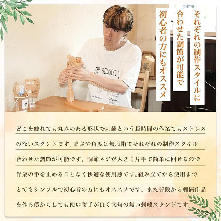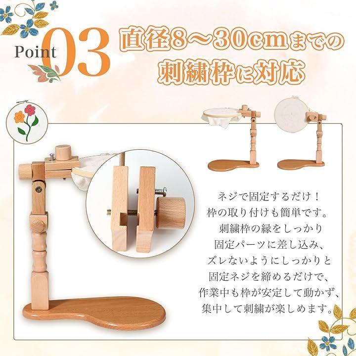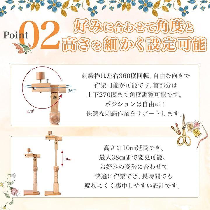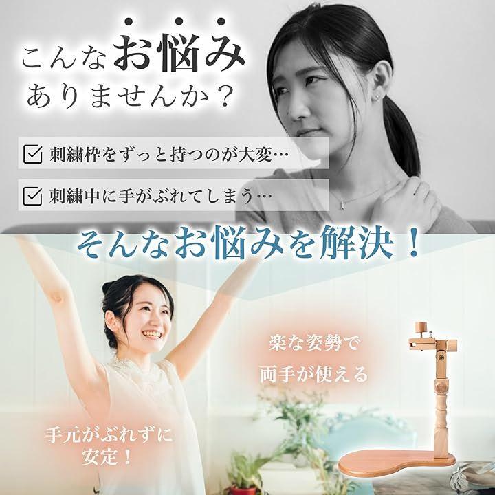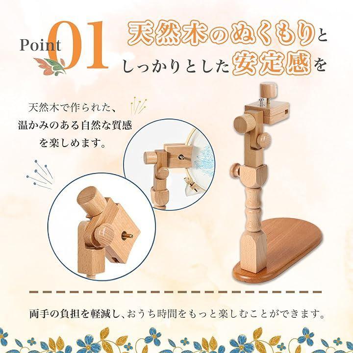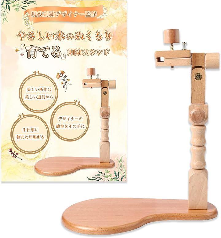 「美しい木目と調整機能で快適な刺繍時間を」 高さと角度が調整可能な木製刺繍スタンド。