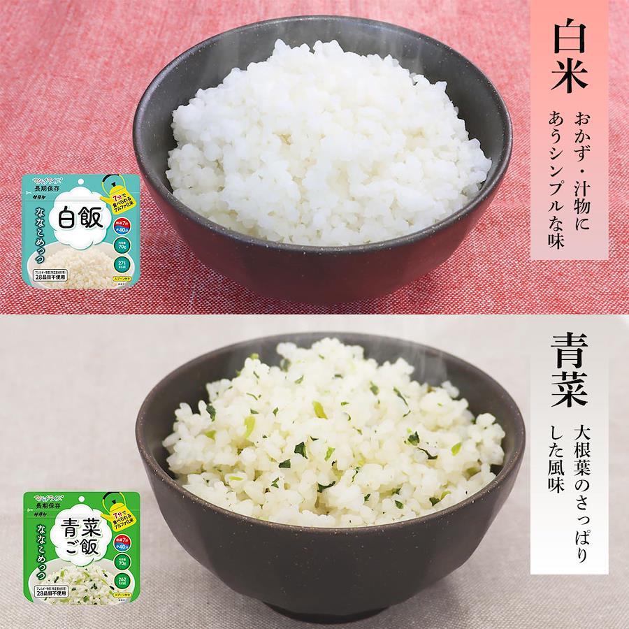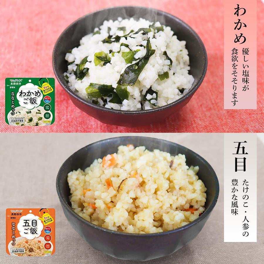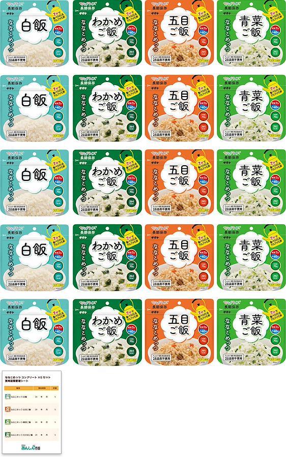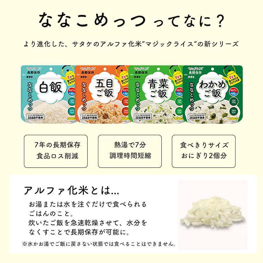 3営業日以内に発送≪新品未開封品≫商品の説明 サタケのマジックライス ななこめっつのコンプリートセットです。ななこめっつは従来のアルファ米より2年賞味期限が伸びた7年保存の非常食です。調理時間も15分から7分に短縮されています。賞味期限管理シートがセットになっているので、賞味期限管理もしやすくなっています。全種類、特定原材料等を不使用。 原材料・成分 【白飯】うるち米(国産) 【わかめご飯】うるち米(国産)、わかめ、調味顆粒(食塩、酵母エキス)/調味料(アミノ酸等)、酸味料 【青菜ご飯】うるち米(国産)、青菜ご飯の具(だいこん葉、食塩、砂糖)/調味料(アミノ酸) 【五目ご飯】うるち米(国産)、調味顆粒(食塩、粉糖、かつお節粉末、こんぶ粉末、しいたけエキス、しいたけ粉末、酵母エキス)、味付けにんじん、ごぼう、しいたけ、味付けれんこん、味付けたけのこ/調味料(アミノ酸)、香料、着色料(カラメル)、pH調整剤