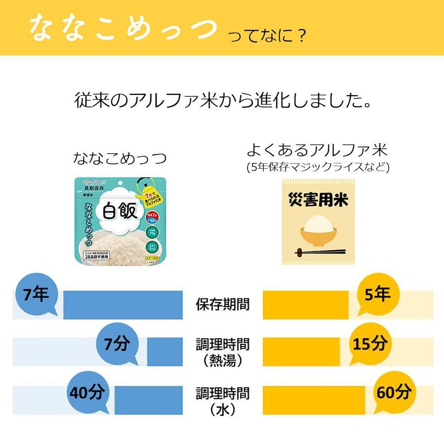 ?米に100年以上携わってきたサタケの『 非常食 アルファ米 ななこめっつ 』です。アルファ米は特殊な方法で乾燥させたお米で、水がお湯を注ぐといつものご飯に戻る非常食です。?ななこめっつは従来のアルファ米より2年賞味期限が伸びた7年の長期保存ができるアルファ米です。また従来は熱湯で調理に15分かかっていたのが、7分で出来上がるようになりました。暖かいまま食べることができます。?原材料のお米は100%国産米を使用しています。?20食がセットになっているので約7日分(1袋を1食換算だと21食で7日分)。3人家族の場合、約2日分の非常食セットになります。?【アレルギー情報】全種類、特定原材料等27品目不使用(同一工場でアレルギー物質を含む商品の加工、梱包をしています)?【賞味期限】製造から7年(流通期間を考慮し、賞味期限は6年半以上あるものになります)?【セット内容】マジックライス ななこめっつ4種類(白飯、わかめご飯、五目ご飯、青菜ご飯)×5セット?【調理時間】熱湯で7分、水(20℃)で40分?【出来上がり量】200g(約おにぎり二個分)【内容量】70g【重要】メーカーによる商品リニューアルに伴いパッケージ(内容量も含む)変更が行われた場合、新パッケージでお届け致します事ご了承願います。