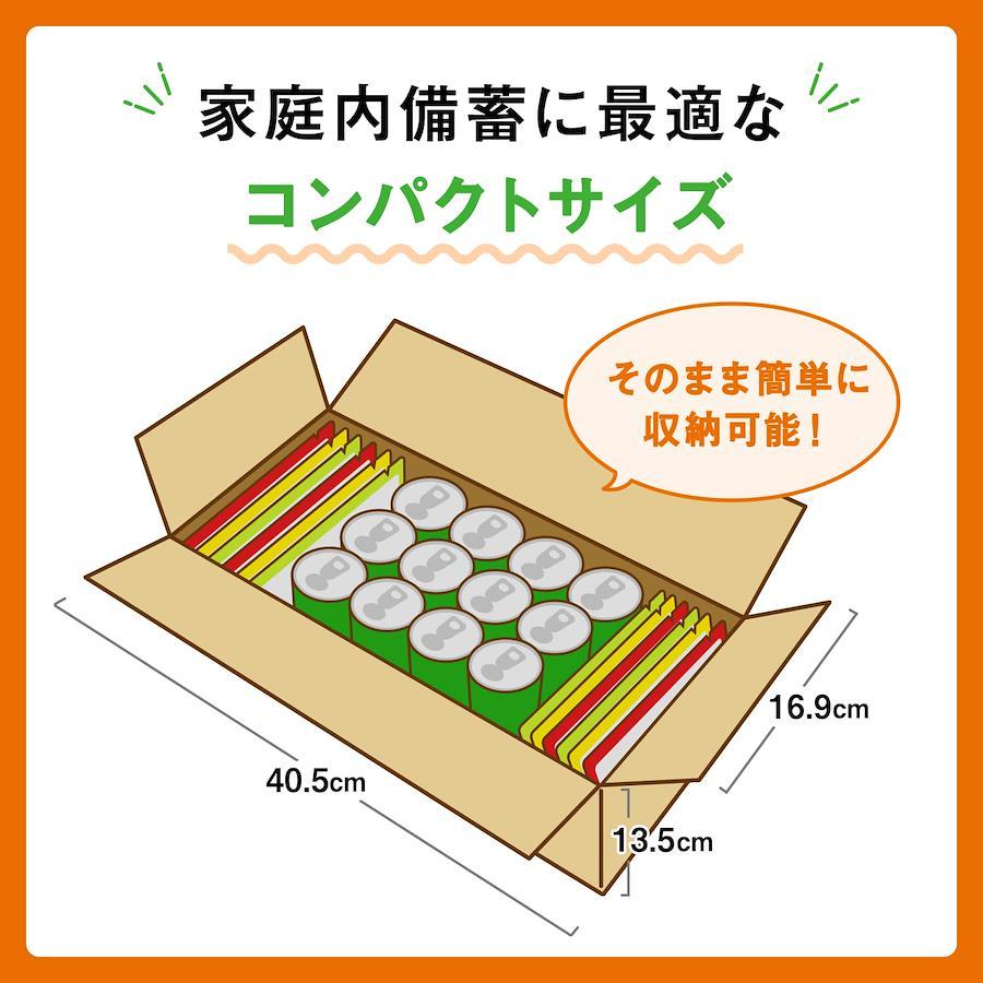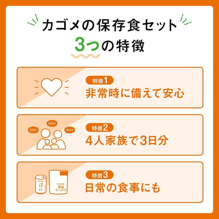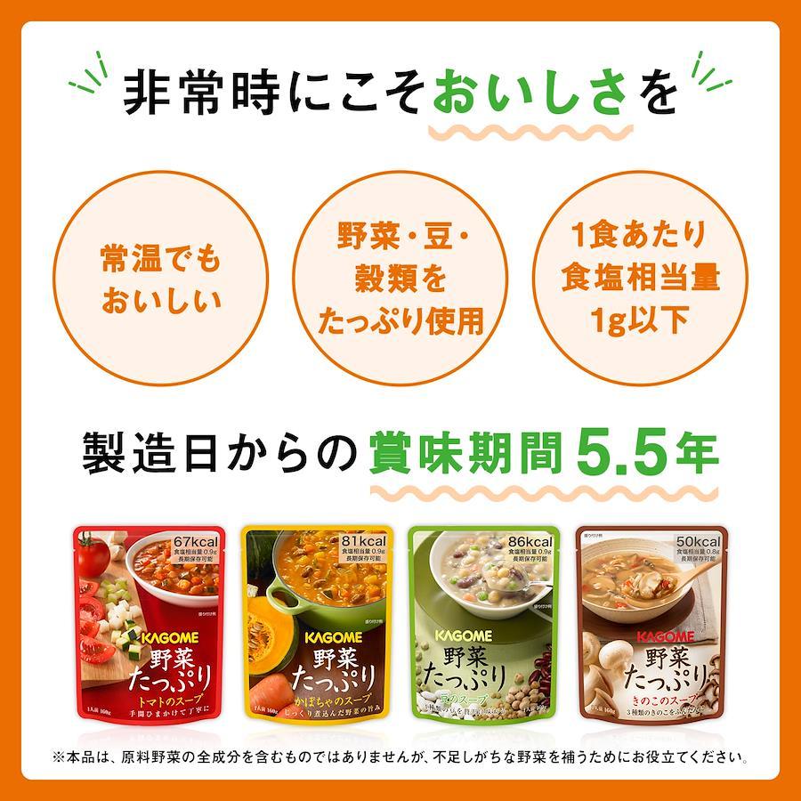 カゴメ 野菜の保存食セットYH-60 【4人世帯×3日分】は、「野菜一日これ一本長期保存用190g」を12本と「野菜たっぷりスープ」を4種×各3個(計12個)を詰め合わせた、長期保存(製造日から5.5年保存)可能な”野菜の保存食”セットです(賞味期間:製造から5.5年)。4人世帯×3日分の非常食がコンパクトなセットに。非常時にはスープは温めずそのまま召し上がることも可能です。地震や台風などの災害時には野菜不足になりがちです。水やアルファ米に加えて野菜も非常食として備蓄することで、万が一の時に備えましょう。また、家庭内やオフィスでの備蓄にもオススメです。非常食用に購入した備蓄の保存食を日常的に使いながら、もしもの時に備える「ローリングストック」を推奨します。※野菜飲料は原料野菜の全成分を含むものではありませんが、災害時に不足しがちな野菜を補うためにお役立てください。 ■トマトのスープ(1袋/160gあたり):67kcal、たんぱく質2.3g、脂質1.4g、炭水化物12.3g、食塩相当量0.9g ■かぼちゃのスープ(1袋/160gあたり):81kcal、たんぱく質2.4g、脂質1.5g、炭水化物15.8g、食塩相当量0.9g ■豆のスープ(1袋/160gあたり):86kcal、たんぱく質4.5g、脂質1.1g、炭水化物16.3g、食塩相当量:0.9g ■きのこのスープ(1袋/160gあたり):50kcal、たんぱく質1.8g、脂質1.0g、炭水化物9.5g、食塩相当量:0.8g■野菜一日これ一本長期保存用(1本/190gあたり):83kcal、たんぱく質1.7g、脂質0g、炭水化物20.0g、ナトリウム0~285mg、食塩相当量0.0~0.8g