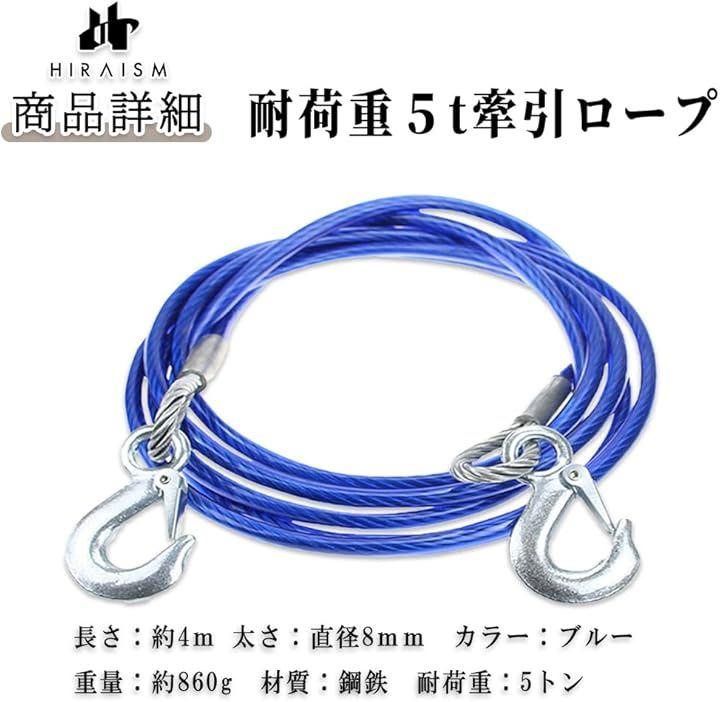 「商品内容」鋼鉄製牽引ロープ <サイズ>長さ:約4m 太さ:約8mm <重量>約860g <材質>鋼鉄 <耐荷重>5トン
