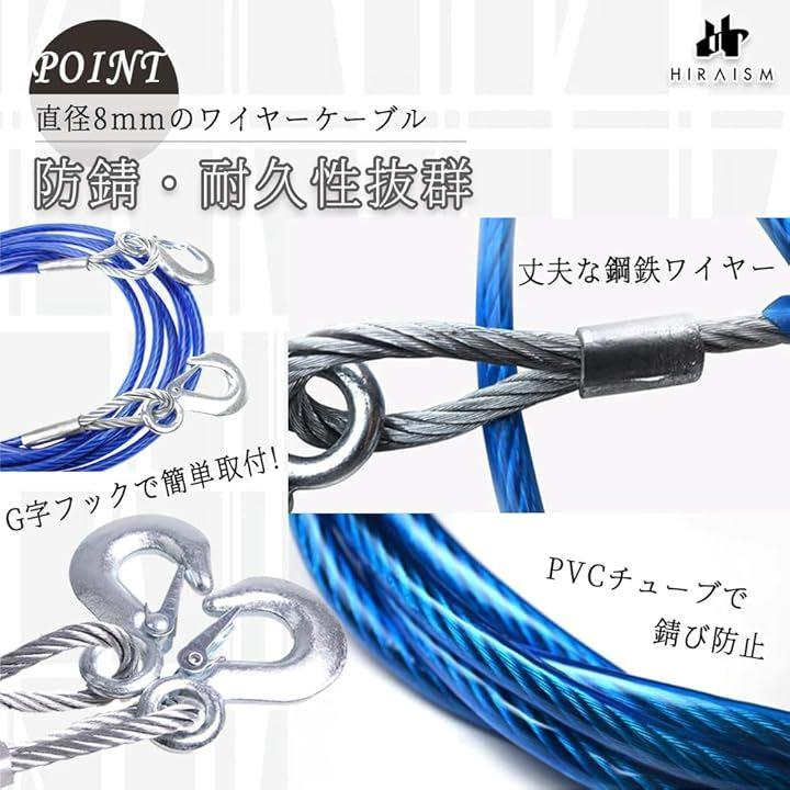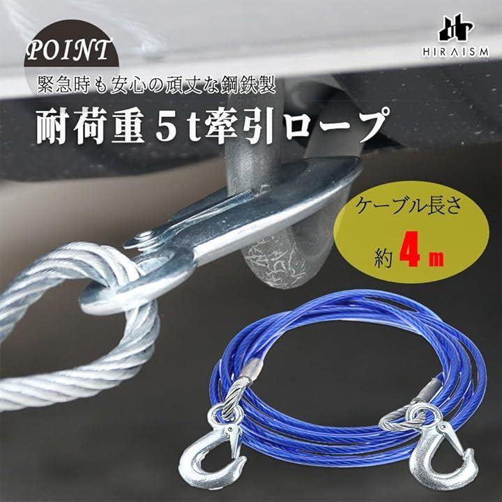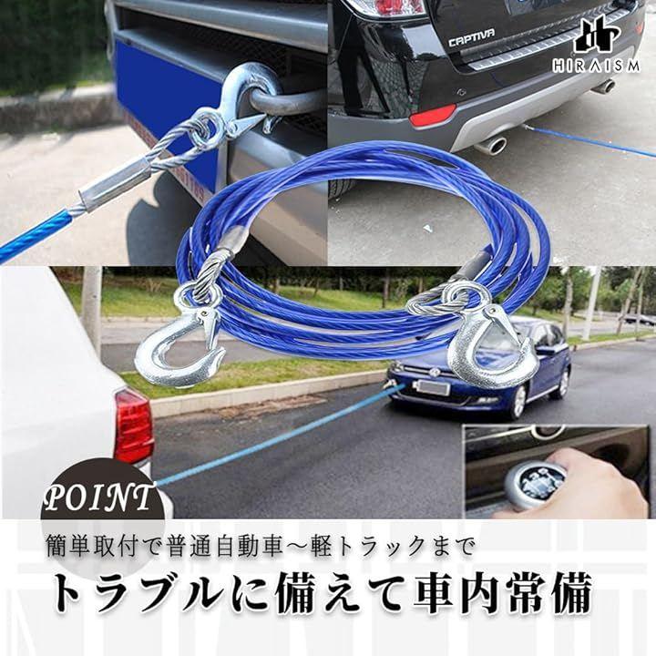 「緊急時も安心の強力サポート」耐荷重5トンの頑丈な鋼鉄製の牽引ロープです。