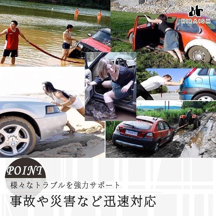 「事故や災害など様々な場面に迅速対応」この牽引ロープを常備しておくことで、突然の事故やエンジントラブルで故障、雪に埋もれた車両の脱出など、災害発生時に迅速な対応が可能です。