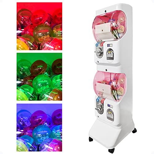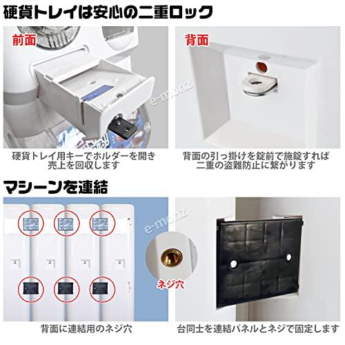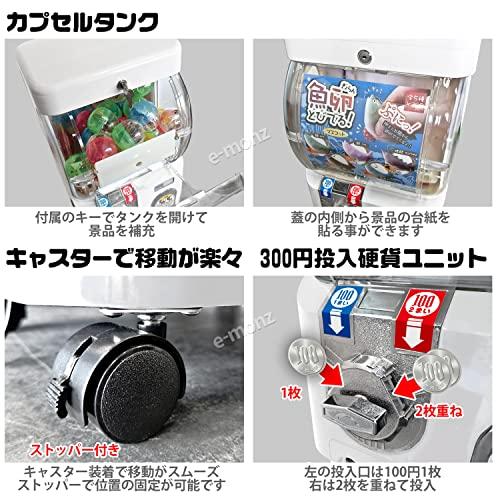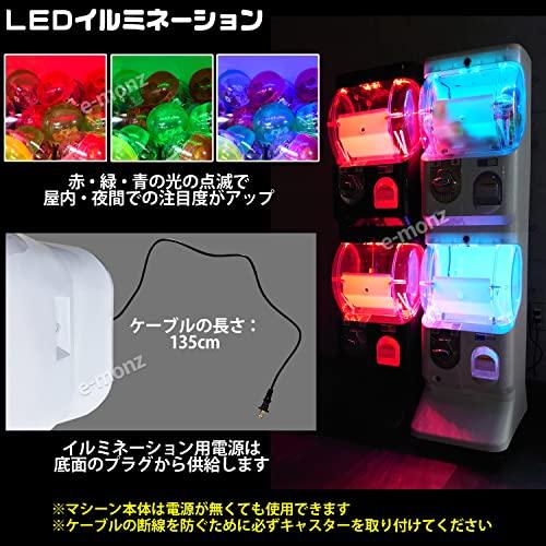 【2階建て+どんどん連結カプセルトイマシーン】ショッピング施設やガチャ専門店でお馴染みの2階建てカプセルトイマシーンを一台から販売致します。マシーンは追加購入で何台でも連結が可能ですので、集客を期待できる賑やかなディスプレイが出来上がります。 【LEDイルミネーションで集客効果アップ】赤・青・緑のLEDイルミネーションがタンクの内部を照らすので注目度抜群!主に屋内や夜間での集客アップが狙えます。マシーンの底にある電源ケーブルを出し、コンセントに挿せばそのまま点滅します。 【大容量カプセルタンク】カプセルは直径45mm~75mmまで対応。タンクの容量は、直径71mmのカプセルなら最大50個までストック可能。大きめで高価な景品のストックに最適です。タンク蓋の部分は景品の台紙を貼り付ける事ができます。 【キャスター装着で移動が楽々】マシーンの場所の移動を前提で設置するなら、付属のキャスターを取り付ける事をお勧めします。車輪ストッパーもついておりますので、ぐらつく事なく設置場所に固定するができます。 【300円投入の硬貨ユニット】本製品は100円3枚を投入する硬貨ユニットを装備しております。左の投入口は100円玉1個、右の投入口は100円玉2個重ねて投入することでハンドルを回す事ができます。【二重ロック可の硬貨トレイ】硬貨トレイは前面のキーロックに加えて、本体背面に突き出している引っ掛けに錠前などで施錠する事で、売上金を二重で守る事ができます。
