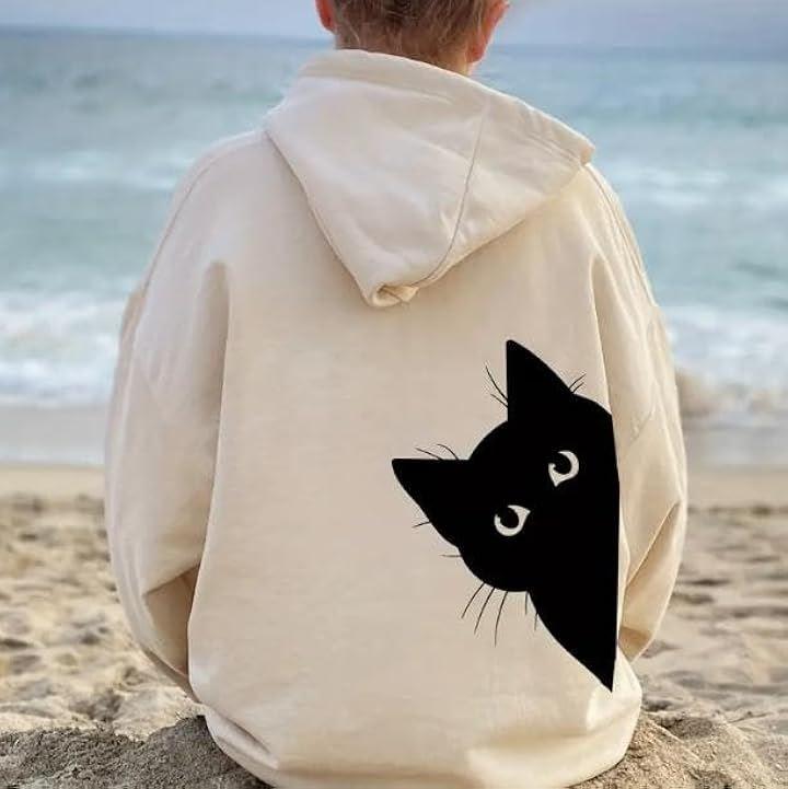ドロップショルダーのシルエットでトレンドのシルエットが作れるネコ柄パーカーです
