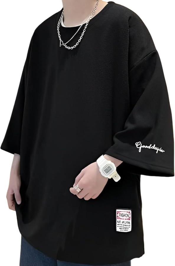 *ゆったりとしたシルエットで、幅の広い7分袖のクルーネックtシャツ