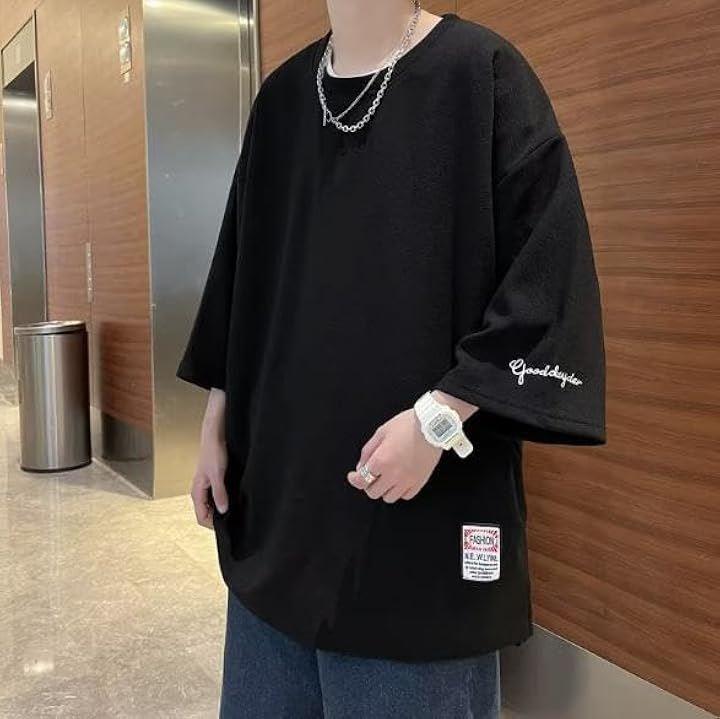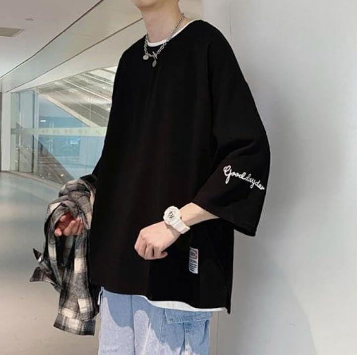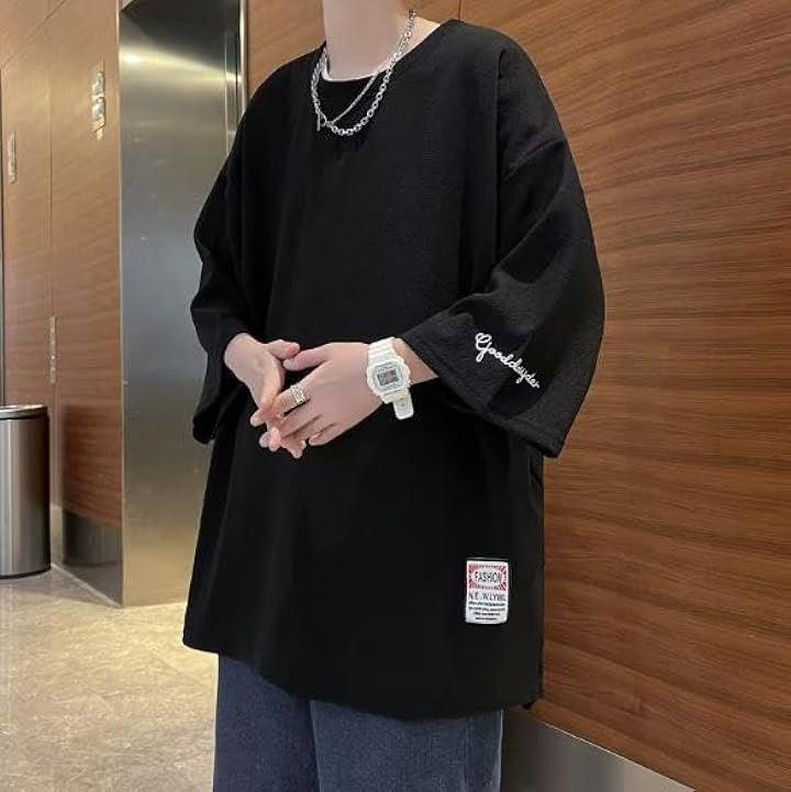 *ゆったりとしたシルエットで、幅の広い7分袖のクルーネックtシャツ
