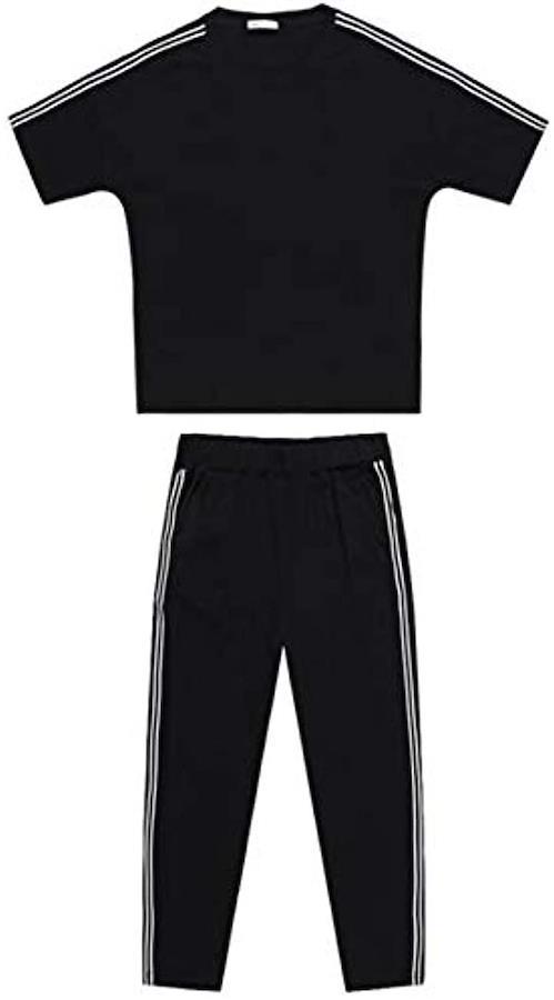 ・*ヨガウエア、ルームウエアにオススメの上下セットジャージ**トップスの肩口とパンツのサイドにトレンドのダブルラインが入ったスタンダードなアイテム**首元はUネックになっているので、インナー1枚で小顔効果がうれしいUネックシャツとしてお使いいただけます*