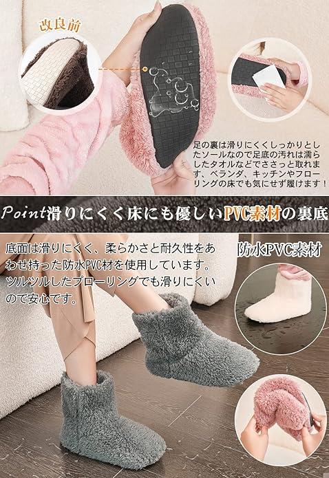 2023改良版ルームシューズ【超防水・滑り止め・防音設計】改良1.超防水:あったかスリッパ底面柔らかさと耐久性をあわせ持った防水PVC材を使用しています。改良2.滑り止め:足の裏は滑りにくくしっかりとしたソールなので足底の汚れは濡らしたタオルなどでささっととれます、キッチンやフローリングの床でも気にせず履けます!床を傷つけません。改良3.防音設計:裏底は消音タイプでの床にも優しいです。パタパタと音がしにくい防音設計なので、足音も気になりません。