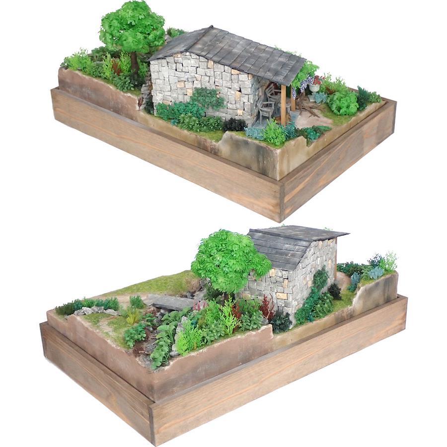 The distinctive stone hut and the garden in harmony with the surrounding nature are recreated in this work.