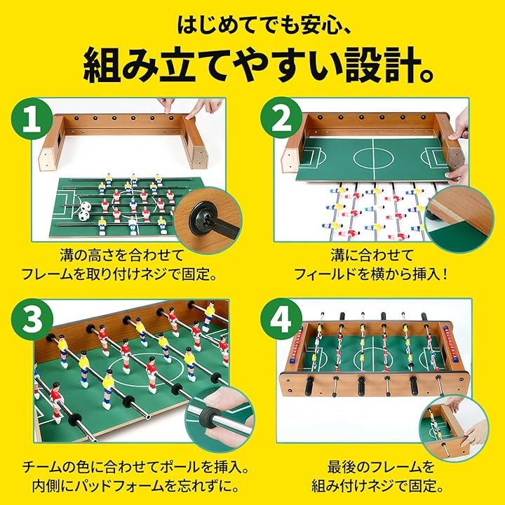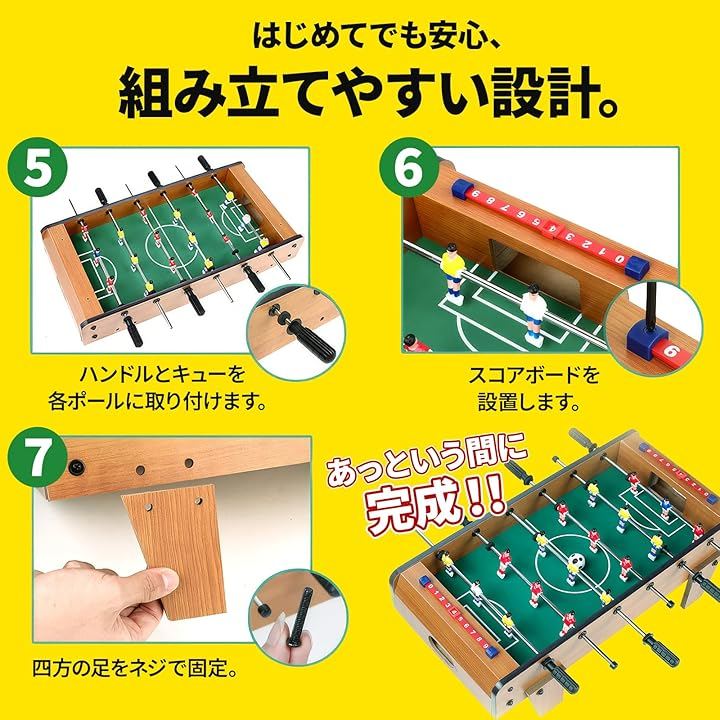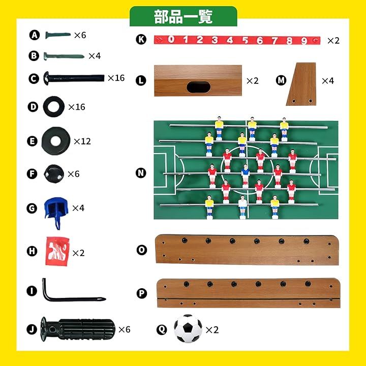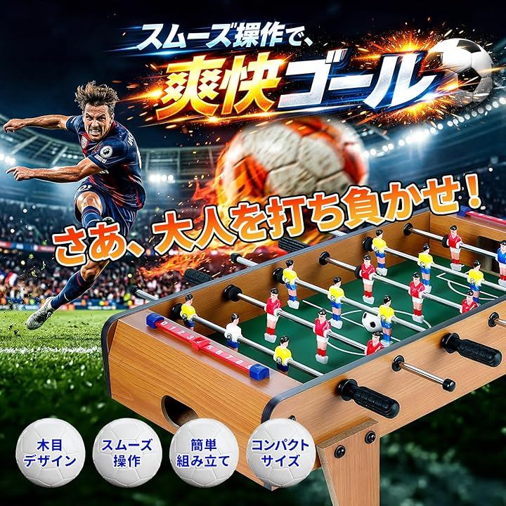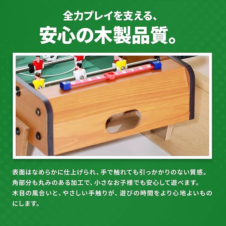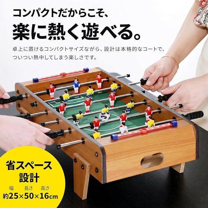 「商品詳細」 ・素材:中密度繊維板 ポリプロピレン ・カラー:木目調 ・サイズ:約25x50x16cm ・重量:約2.4kg ・付属品:ボール2個 ・特徴:コンパクト設計、滑りにくいハンドル、回転ロッド、スコアカウンター搭載 ・用途:室内遊び、家族レクリエーション、パーティー、ギフト