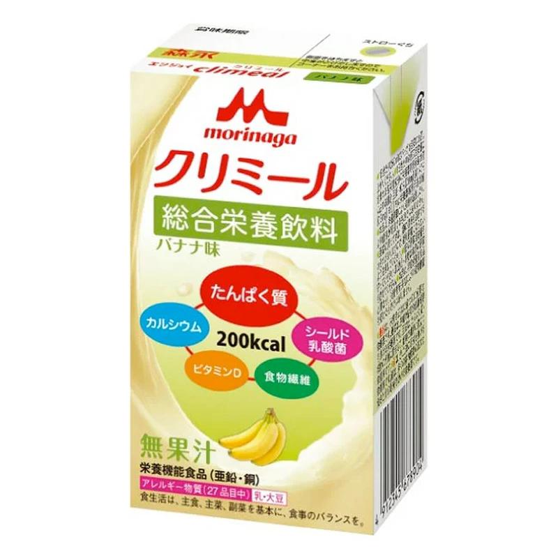 商品区分:栄養機能食品(栄養成分:亜鉛、銅)【エンジョイクリミール バナナ味の商品詳細】●補食に適した飲みきりサイズの125mLで200kcaL摂取できます。●1本でエネルギー・タンパク質のほか、主要栄養成分をバランスよく補給できます。●忙しい朝に、食事の量が不足しがちな時に、食事が偏っている時におススメです。●亜鉛・銅・ビタミン類・食物繊維を強化しています。●乳酸菌を100億コ配合●8つの味で、おいしく飲めます。【栄養成分(栄養機能食品)】亜鉛、銅【保健機能食品表示】・亜鉛は、味覚を正常に保つ、皮膚や粘膜の健康維持を助ける、たんぱく質・核酸の代謝に関与して健康維持に役立つ栄養素です。・銅は、赤血球の形成を助け、多くの体内酵素の正常な働きと骨の形成を助ける栄養素です。【品名・名称】栄養補助飲料【エンジョイクリミール バナナ味の原材料】デキストリン(国内製造)、乳たんぱく質、植物油、グラニュー糖、難消化性デキストリン、乳酸菌(殺菌)、乾燥酵母/カゼインNa、pH調整剤、乳化剤、塩化K、炭酸Mg、V.C、香料、クチナシ色素、クエン酸鉄Na、V.E、ニコチン酸アミド、グルコン酸亜鉛、パントテン酸Ca、V.B6、グルコン酸銅、V.B2、V.B1、V.A、葉酸、ビオチン、V.B12、V.D、(一部に乳成分、大豆を含む)【栄養成分】熱量:200kcal、たんぱく質:7.5g、脂質:6.7g、糖質:26.8g、食物繊維:2.5g、ナトリウム:110mg、カルシウム138mg、亜鉛:1.4mg、銅:0.14mg、ビタミンD:1.2μg【アレルギー物質】乳成分、大豆【保存方法】室温で保存できますが、なるべく冷所に保管してください。【注意事項】・牛乳・大豆由来の成分が含まれています。アレルギーを示す方は使用しないでください。・容器に漏れ・膨脹等が見られるもの、開封時に内容物の色・臭い・味に異常があるものはお飲みにならないでください。・原材料の一部が沈殿・浮遊することがありますが、品質には問題ありません。開封前によく振ってからお飲みください。・静脈内ヘは絶対に注入しないでください。・容器が落下、衝撃等により破損しますと、無菌性が損なわれます。取扱いには十分注意してください。・容器に漏れ・膨脹等がみられるもの及び容器の破損しているものはお飲みにならないでください。・室温で保存できますが、おいしさを保つために冷所での保管をおすすめします。・直射日光があたる場所や、高温な場所、凍結するような場所で保管しますと、風味劣化等の性状変化が認められる場合があります。★亜鉛に関する注意・本品は、多量摂取により疾病が治癒したり、より健康が増進するものではありません。1日の摂取目安量を守ってください。・本品は、特定保健用食品と異なり、消費者庁長官による個別審査を受けたものではありません。・亜鉛の摂りすぎは、銅の吸収を阻害するおそれがありますので、過剰摂取にならないよう注意してください。・1日の摂取目安量を守ってください。★銅に関する注意・本品は、多量摂取により疾病が治癒したり、より健康が増進するものではありません。1日の摂取目安量を守ってください。・本品は、特定保健用食品と異なり、消費者庁長官による個別審査を受けたものではありません。・多量に摂取すると軟便(下痢)になることがあります。・1日の摂取目安量を守ってください。・乳幼児・小児は本品の摂取を避けてください。【原産国】日本【発売元、製造元、輸入元又は販売元】森永乳業商品に関するお電話でのお問合せは、下記までお願いいたします。受付時間 平日9:00-17:00(年末年始を除く)商品全般:0120-369-744育児・栄養食品:0120-303-633リニューアルに伴い、パッケージ・内容等予告なく変更する場合がございます。予めご了承ください。(エンジョイclimeal)森永乳業108-8384 東京都港区芝5-33-1※お問合せ番号は商品詳細参照