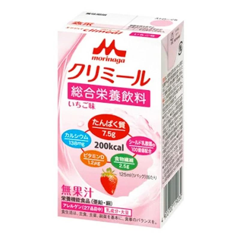 商品区分:栄養機能食品(栄養成分:亜鉛、銅)【エンジョイクリミール いちご味の商品詳細】●補食に適した飲みきりサイズの125mLで200kcaL摂取できます。●1本でエネルギー・タンパク質のほか、主要栄養成分をバランスよく補給できます。●忙しい朝に、食事の量が不足しがちな時に、食事が偏っている時におススメです。●亜鉛・銅・ビタミン類・食物繊維を強化しています。●乳酸菌を100億コ配合●8つの味で、おいしく飲めます。【栄養成分(栄養機能食品)】亜鉛、銅【保健機能食品表示】・亜鉛は、味覚を正常に保つ、皮膚や粘膜の健康維持を助ける、たんぱく質・核酸の代謝に関与して健康維持に役立つ栄養素です。・銅は、赤血球の形成を助け、多くの体内酵素の正常な働きと骨の形成を助ける栄養素です。【品名・名称】栄養補助飲料【エンジョイクリミール いちご味の原材料】デキストリン(国内製造)、乳たんぱく質、植物油、グラニュー糖、難消化性デキストリン、乳酸菌(殺菌)、乾燥酵母/カゼインNa、pH調整剤、乳化剤、塩化K、炭酸Mg、V.C、香料、紅麹色素、クエン酸鉄Na、V.E、ニコチン酸アミド、クチナシ色素、グルコン酸亜鉛、コチニール色素、パントテン酸Ca、V.B6、グルコン酸銅、V.B2、V.B1、V.A、葉酸、ビオチン、V.B12、V.D、(一部に乳成分、大豆を含む)【栄養成分】熱量:200kcal、たんぱく質:7.5g、脂質:6.7g、糖質:26.8g、食物繊維:2.5g、ナトリウム:110mg、カルシウム138mg、亜鉛:1.4mg、銅:0.14mg、ビタミンD:1.2μg【アレルギー物質】乳成分、大豆【保存方法】室温で保存できますが、なるべく冷所に保管してください。【注意事項】・牛乳・大豆由来の成分が含まれています。アレルギーを示す方は使用しないでください。・容器に漏れ・膨脹等が見られるもの、開封時に内容物の色・臭い・味に異常があるものはお飲みにならないでください。・原材料の一部が沈殿・浮遊することがありますが、品質には問題ありません。開封前によく振ってからお飲みください。・静脈内ヘは絶対に注入しないでください。・容器が落下、衝撃等により破損しますと、無菌性が損なわれます。取扱いには十分注意してください。・容器に漏れ・膨脹等がみられるもの及び容器の破損しているものはお飲みにならないでください。・室温で保存できますが、おいしさを保つために冷所での保管をおすすめします。・直射日光があたる場所や、高温な場所、凍結するような場所で保管しますと、風味劣化等の性状変化が認められる場合があります。★亜鉛に関する注意・本品は、多量摂取により疾病が治癒したり、より健康が増進するものではありません。1日の摂取目安量を守ってください。・本品は、特定保健用食品と異なり、消費者庁長官による個別審査を受けたものではありません。・亜鉛の摂りすぎは、銅の吸収を阻害するおそれがありますので、過剰摂取にならないよう注意してください。・1日の摂取目安量を守ってください。★銅に関する注意・本品は、多量摂取により疾病が治癒したり、より健康が増進するものではありません。1日の摂取目安量を守ってください。・本品は、特定保健用食品と異なり、消費者庁長官による個別審査を受けたものではありません。・多量に摂取すると軟便(下痢)になることがあります。・1日の摂取目安量を守ってください。・乳幼児・小児は本品の摂取を避けてください。【原産国】日本【発売元、製造元、輸入元又は販売元】森永乳業商品に関するお電話でのお問合せは、下記までお願いいたします。受付時間 平日9:00-17:00(年末年始を除く)商品全般:0120-369-744育児・栄養食品:0120-303-633リニューアルに伴い、パッケージ・内容等予告なく変更する場合がございます。予めご了承ください。(エンジョイclimeal イチゴ味 苺味)森永乳業108-8384 東京都港区芝5-33-1※お問合せ番号は商品詳細参照