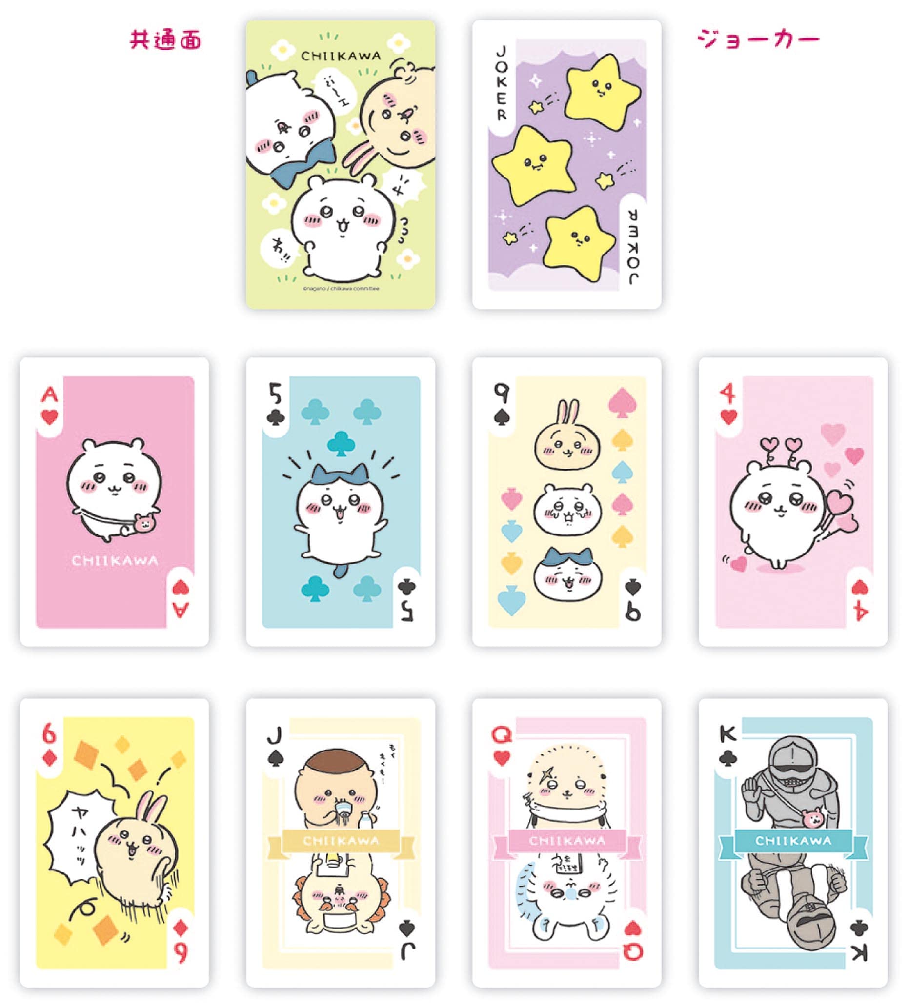 待望の「ちいかわ」トランプが、ついに発売決定です!大人気「ちいかわ」のトランプが、溝を持して発売になります!ちいかわ、ハチワレ、うさぎをはじめとする、大人気キャラたちのイラストをこれでもかと収録!眺めているだけでも楽しい、盛り沢山なトランプになっています。 【サイズ】カード:約H89×W58mm 【素材】本体:紙、ケース:PS