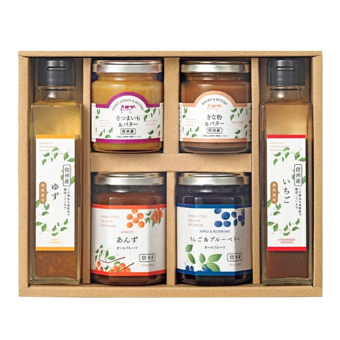 あんずスプレッド、りんご&ブルーベリースプレッド各140g、さつまいも&バターペースト、きな粉&バターペースト各110g、ゆずドレッシング、いちごドレッシング各150ml×各1【乳】