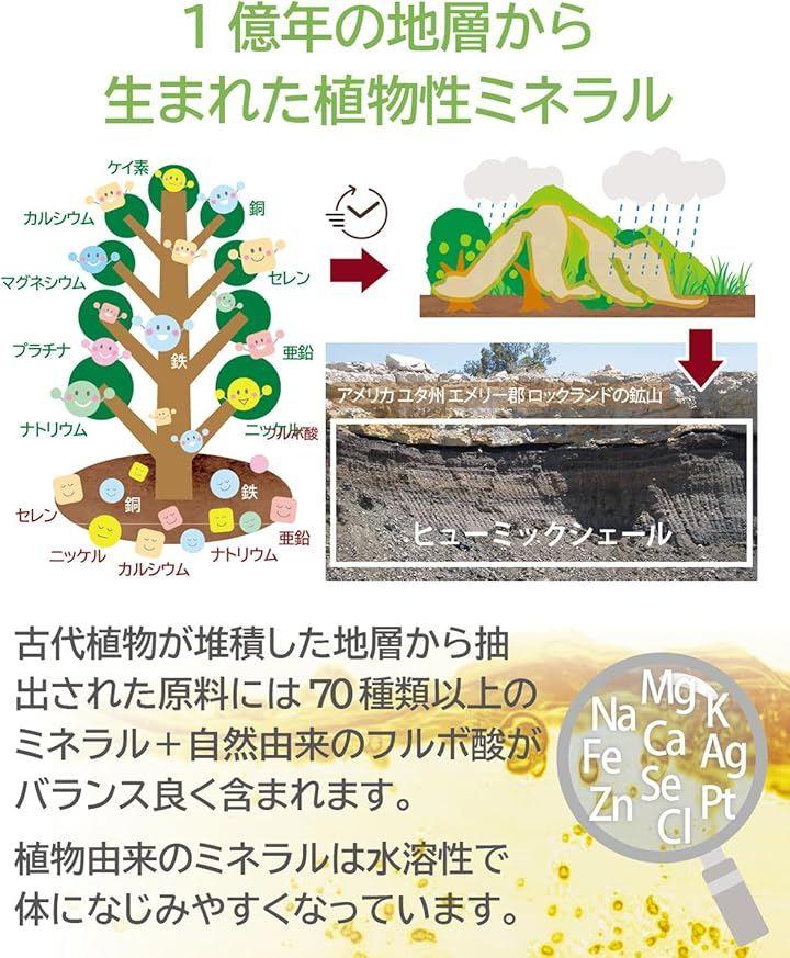 「天然ミネラル70種類以上」大地に眠るヒューミックシェールから抽出された天然ミネラルを使用。